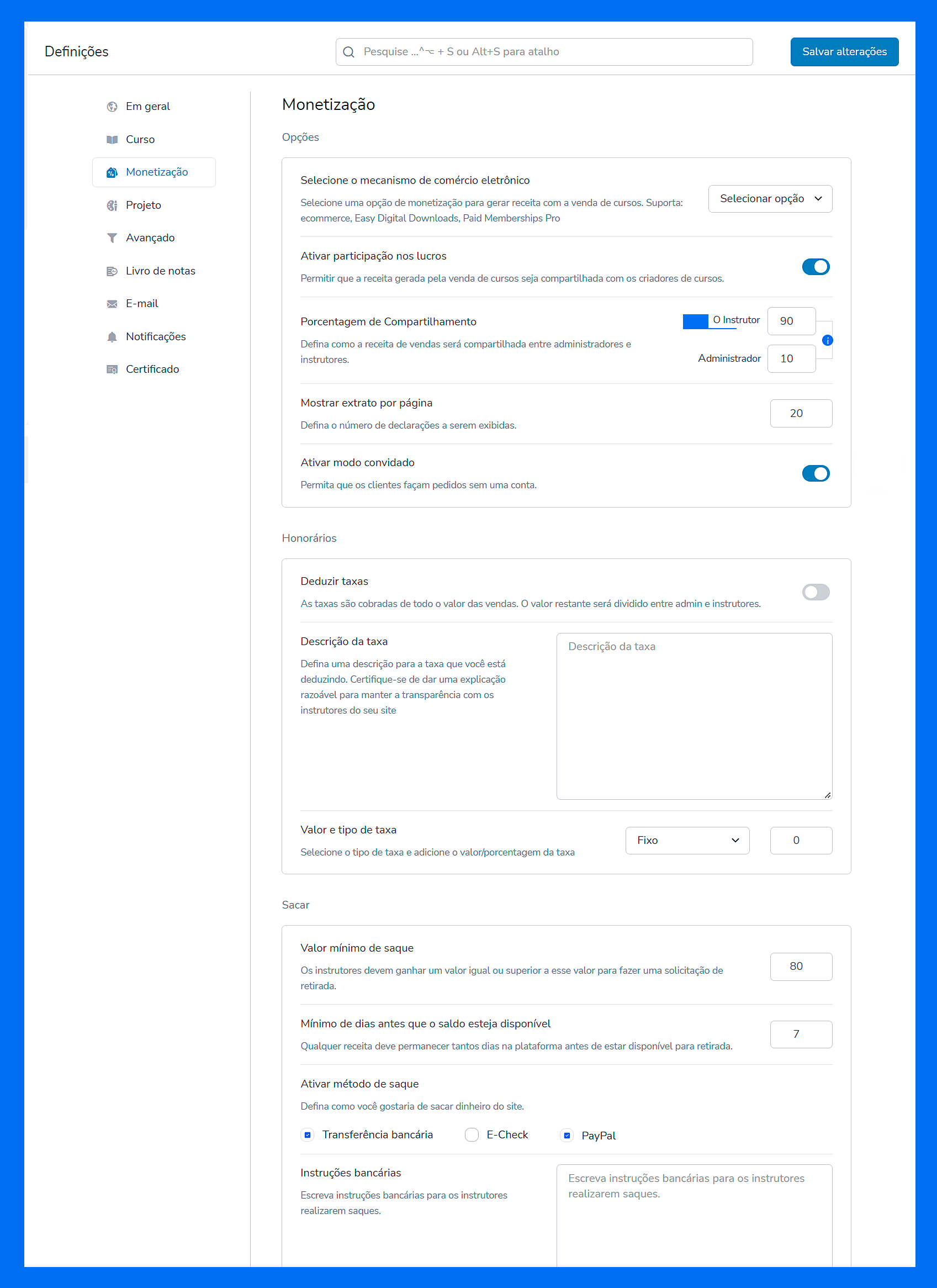 **Valor mínimo de saque:** os instrutores devem ganhar um valor igual ou superior a esse valor para fazer uma solicitação de saque. Defina o valor mínimo que eles poderão sacar.